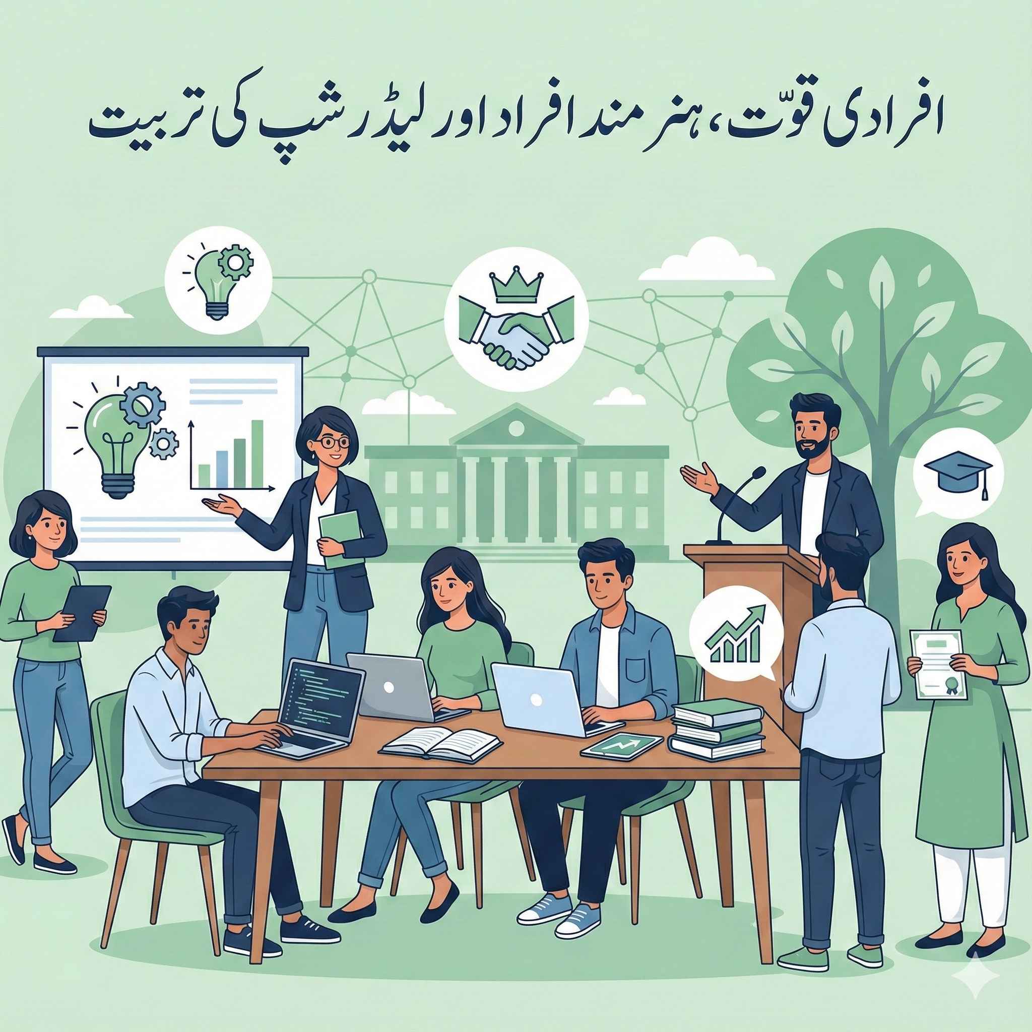 Rights education, clean governance, and environmental responsibility.5. Human Capital & Leadership (افرادی قوّت، ہنرمند افراد اور لیڈرشپ کی تربیت)